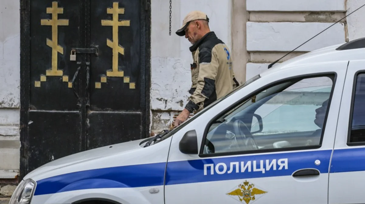 Мужчина проходит мимо полицейской машины, припаркованной возле православной церкви. Фото: Юрий Кочетков / EPA
