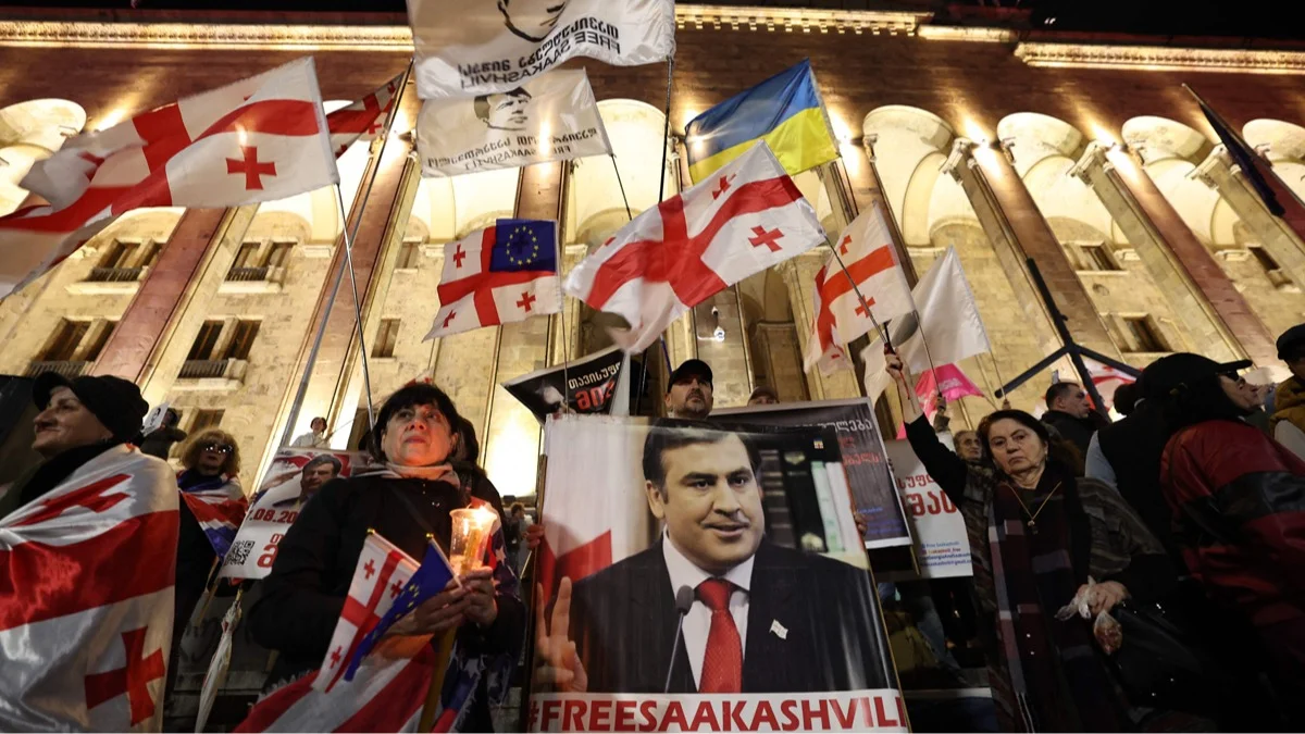 Протестующий держит плакат с изображением арестованного бывшего президента Грузии Михаила Саакашвили во время митинга, приуроченного к годовщине парламентских выборов, у здания парламента в Тбилиси, Грузия 26 октября 2025 года. Фото: Giorgi Arjevanidze / AFP / Scanpix / LETA