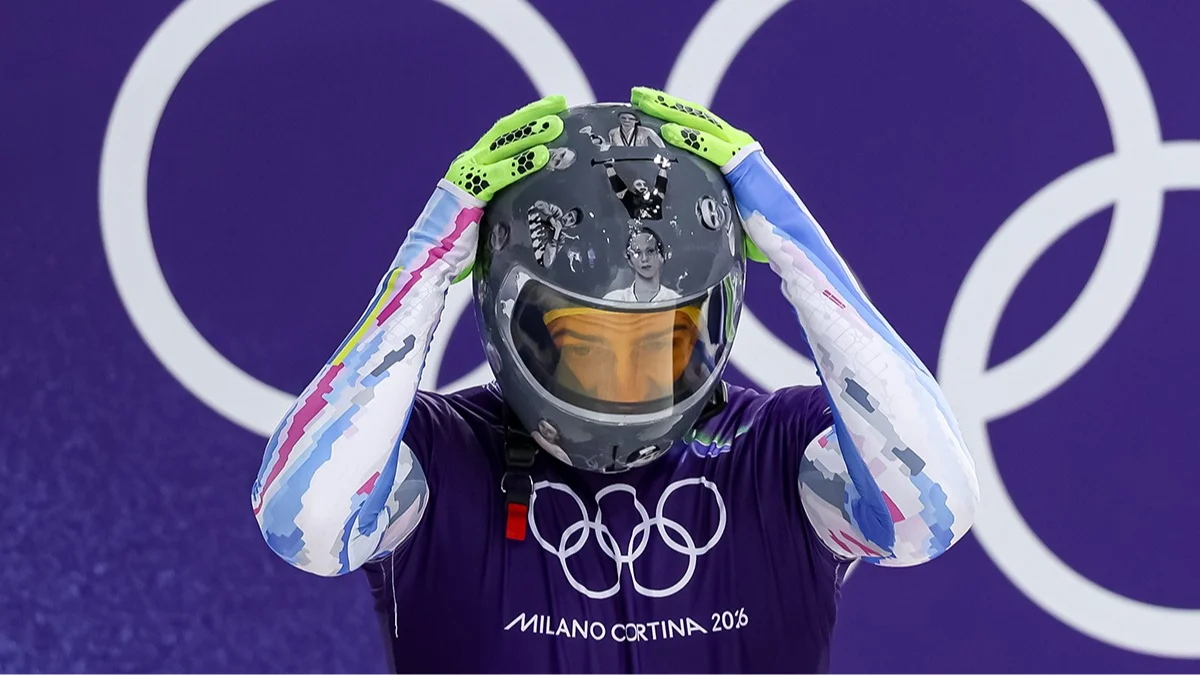 Украинский скелетонист Владислав Гераскевич из Украины в шлеме памяти об украинских спортсменах, погибших на войне, Кортина д'Ампеццо, Италия, 11 февраля 2026 года. Фото: Andrea Solero / EPA