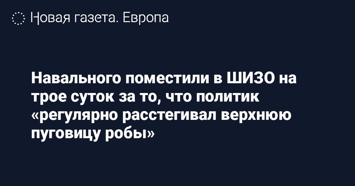 Политика Алексея Навального, отбывающего наказание в исправительной колонии №6 в Мелехово Владимирской области, поместили в штрафной изолятор (ШИЗО) за то, что он «регулярно расстегивал верхнюю пуговицу робы», находясь на промзоне. Об этом Навальный рассказал в своем инстаграме.