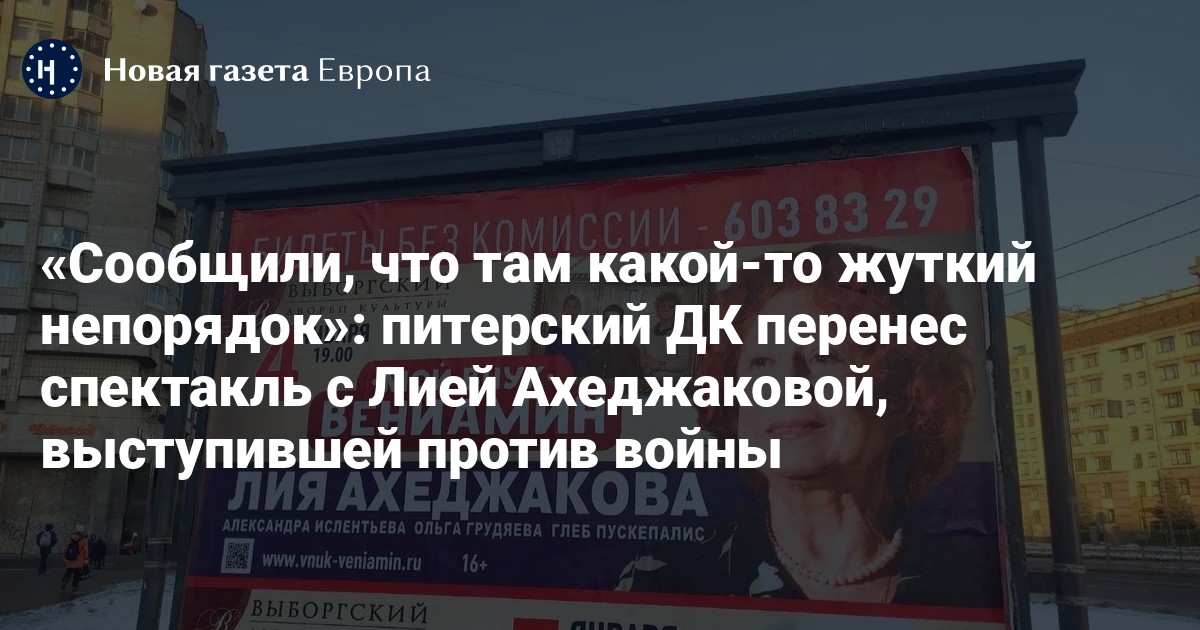 В Санкт-Петербурге Выборгский дворец культуры объявил о переносе спектакля «Мой внук Вениамин» с участием Лии Ахеджаковой. Об этом сообщается на сайте ДК.