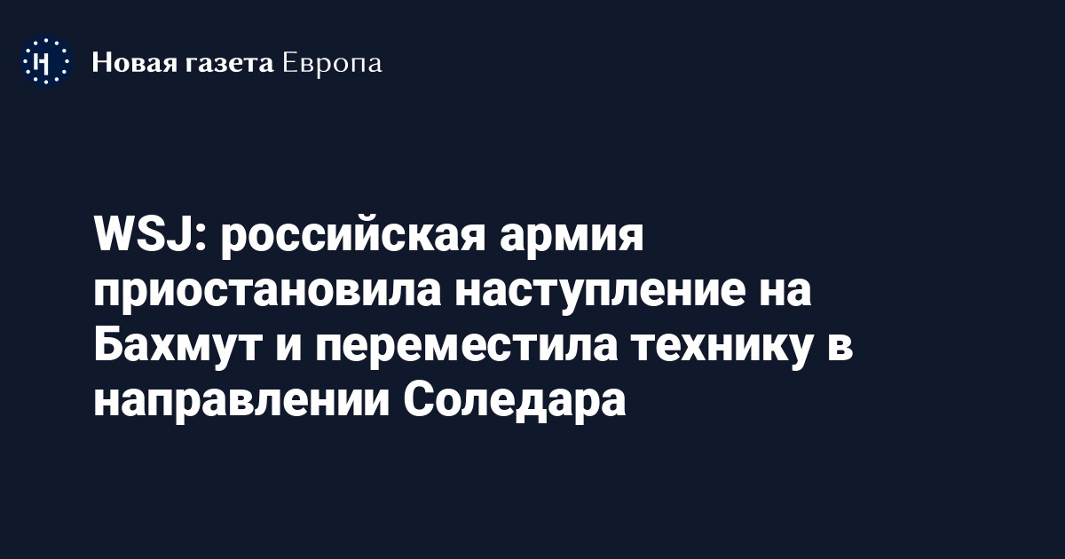 Российская армия приостановила наступление на Бахмут в Донецкой области и переместила ресурсы в направлении близлежащего города Соледар, сообщает The Wall Street Journal со ссылкой на украинских военных.