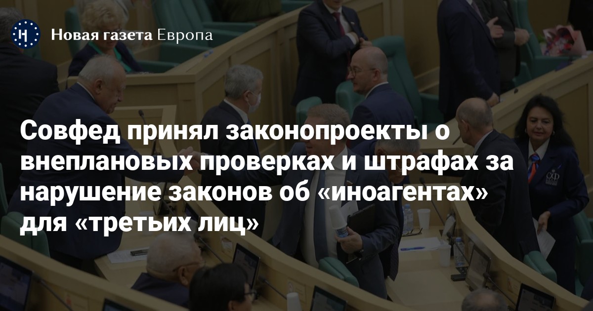Совет федерации России поддержал два законопроекта, которые введут внеплановые проверки и штрафы за нарушение законодательства об «иноагентах» для лиц, взаимодействующих с «иноагентами». Об этом говорится на сайте СФ.