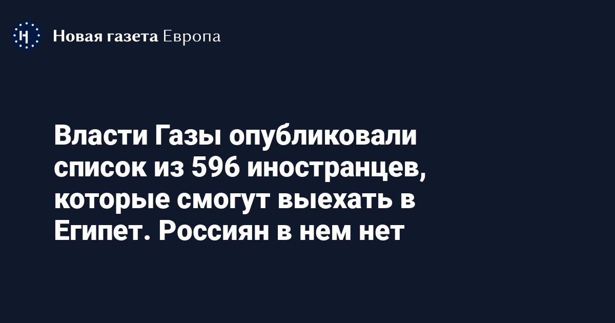 Пограничная служба сектора Газа опубликовала список из 596 иностранцев и лиц с двойным гражданством, которые 2 ноября смогут выехать в Египет через пропускной пункт «Рафах». Об этом сообщает пресс-служба ведомства. В списке значатся 400 граждан США и ни одного россиянина.
