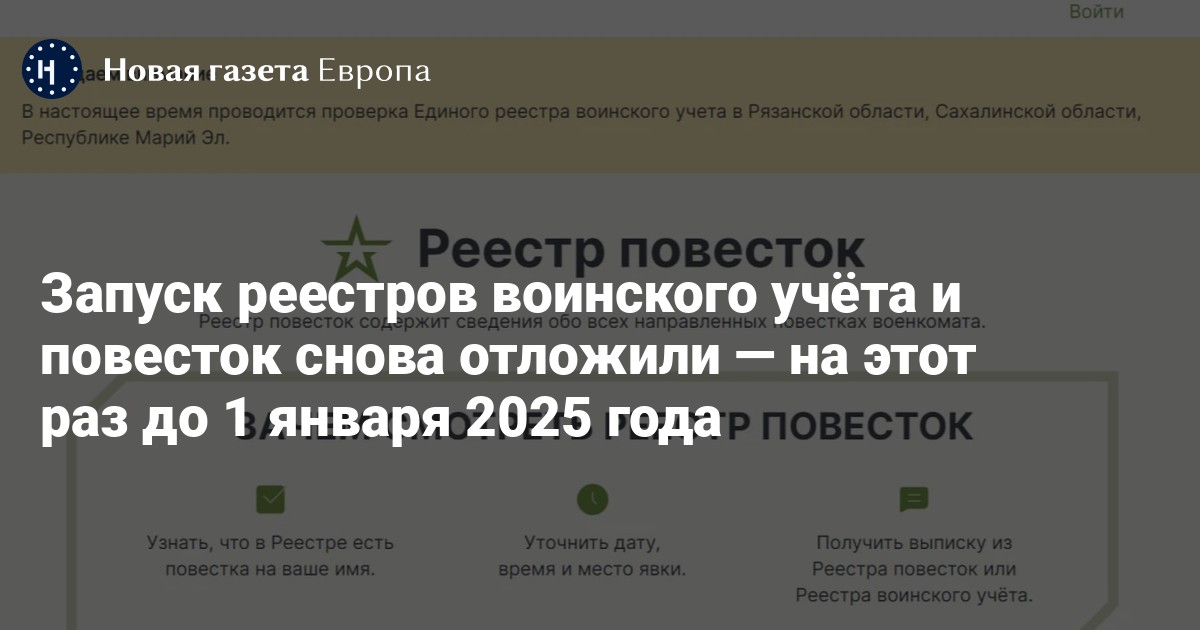 В середине апреля Правительство РФ опубликовало постановление о «Едином реестре сведений о военнообязанных гражданах». Согласно нему, функционирования реестра, «включая работу с повестками», должно было начаться с 1 ноября 2024 года.