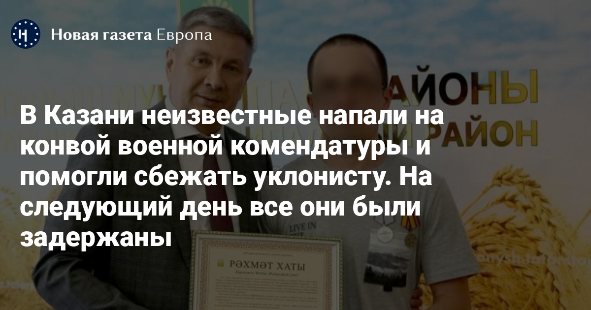 Вечером 24 октября в Казани неизвестные напали на конвой военной комендатуры и помогли сбежать уклонисту. Об этом сообщают «Коммерсант» и Baza.