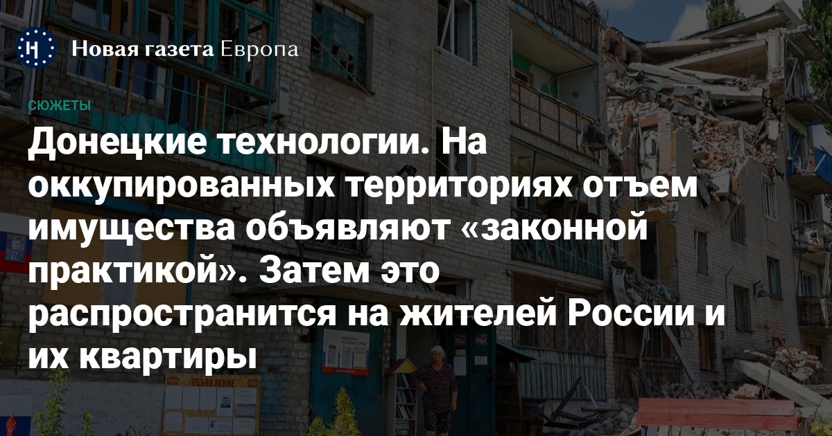 В Москве готовят к принятию законопроект о передаче в государственную собственность «бесхозных» квартир, домов и помещений на украинских оккупированных территориях. Об этом 20 октябрясообщила газета «Ведомости» как о новости. Как будто в Донецке и Луганске конвейером не отбирают имущество у законных хозяев начиная с 2014 года — даже не по не местным «законам», а просто по «указу глав республик».