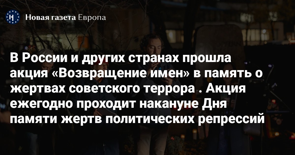 29 октября в разных странах, включая Россию, прошла ежегодная акция «Возвращение имен», во время которой люди читают вслух имена жертв советского террора. Трансляция акции в разных городах велась в ютуб-канале «Мемориала».