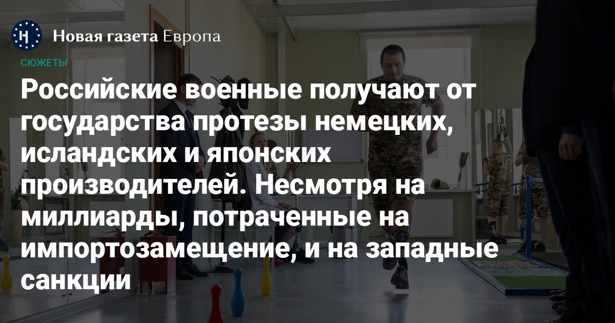 Замминистра обороны РФ Анна Цивилева говорила, что Россия вышла на «флагманский уровень» в вопросе протезирования после начала войны в Украине. Но аудитор Счетной палаты РФ Светлана Орлова озвучила другие данные: больше половины протезов для участников «спецоперации» Россия покупает в «недружественных» странах, несмотря на программу импортозамещения, на которую, по словам Орловой, потратили 850 млрд рублей. «Новая-Европа» изучила сюжеты региональных телеканалов и увидела, что российские военные получают протезы крупнейших производителей из Германии, Исландии и Японии.