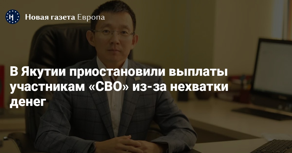 Министр финансов Якутии Иван Алексеев сообщил, что выплаты участникам войны в Украине были приостановлены из-за нехватки бюджетных средств — в ведомстве не смогли заранее подсчитать, какому количеству человек потребуются деньги. Об этом пишут местные СМИ.