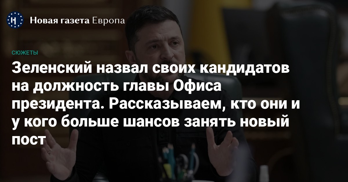 8 декабря Владимир Зеленский назвал имена пяти кандидатов на должность главы Офиса президента. Среди них — министр обороны Денис Шмыгаль, первый вице-премьер — министр цифровой трансформации Михаил Федоров, начальник Главного управления разведки Минобороны Кирилл Буданов, заместитель руководителя офиса президента Павел Палиса и заместитель министра иностранных дел Сергей Кислица. Сам Зеленский еще взвешивает варианты, потому что все чиновники уже занимают важные должности.