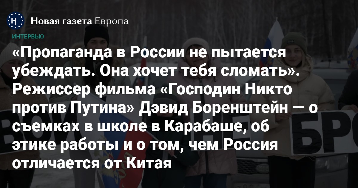 Редактор «Новой газеты Европа» Александр Горбачев поговорил с Боренштейном о том, с чего начался «Господин Никто», как итоговый сюжет фильма определили соображения безопасности и что он понял про путинскую Россию.