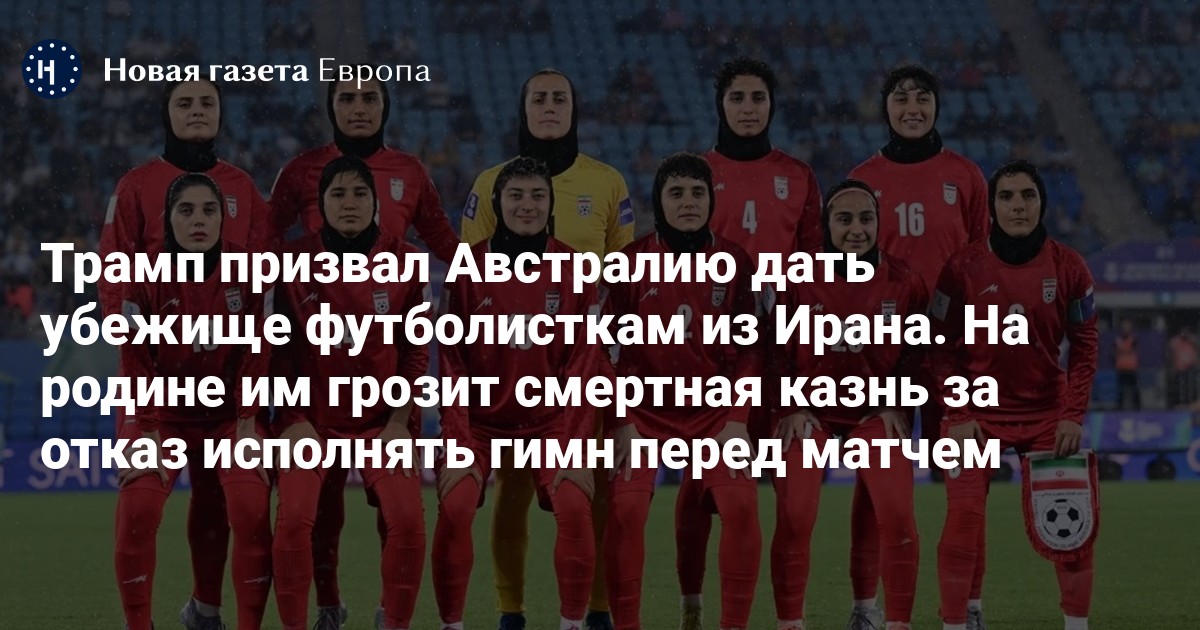 Президент США Дональд Трамп призвал власти Австралии предоставить убежище участникам иранской женской сборной по футболу. Ранее они отказались исполнять гимн перед матчем — правозащитники считают, что на родине им может грозить смертная казнь.