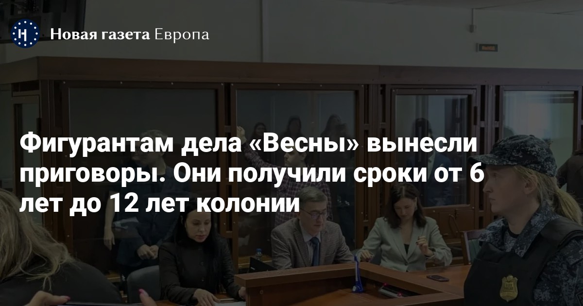 Санкт-Петербургский городской суд вынес приговоры фигурантам дела «Весны». Они получили сроки от 6 лет и двух месяцев до 12 лет колонии, сообщает «Медиазона».