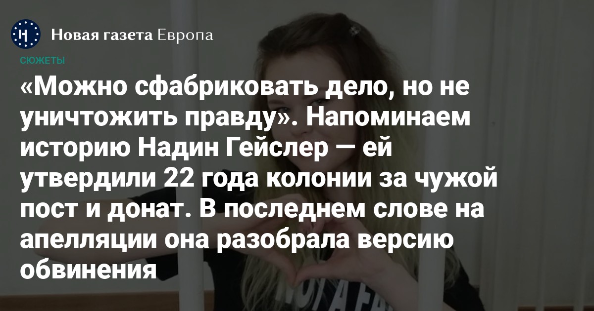 Напоминаем историю Надин Гейслер — ей утвердили 22 года колонии за чужой пост и донат. В последнем слове на апелляции она разобрала версию обвинения