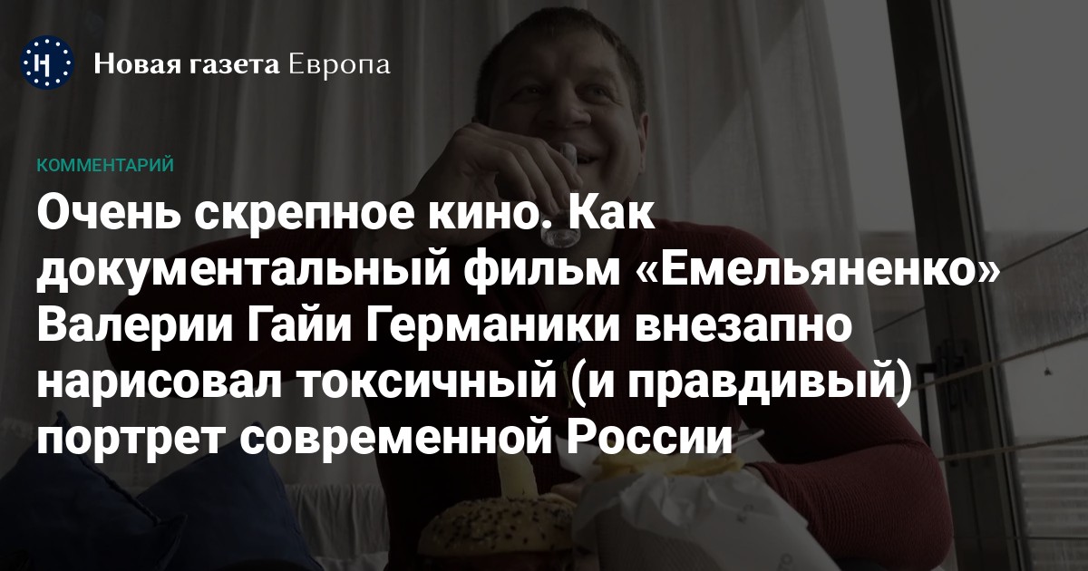Кино Валерии Гайи Германики предельно, почти болезненно честное, и «Емельяненко» — не исключение; камера опускается с борцом на самое глубокое дно, но эта честность, как и почти всё в России 2026 года, гибридная. Снять фильм о Емельяненко и не называть причину его отсидки — это как снять фильм о Михаиле Ефремове и не упомянуть ДТП на Смоленской площади, или рассказывать о Владимире Путине — и не сказать об убийствах Анны Политковской, Бориса Немцова и Алексея Навального. Сам Емельяненко говорит в кадре: «Я — романтик. Выпил, подрался, в тюрьму». Но сел он в тюрьму не за драку, а за изнасилование. И как он обращается с женщинами, если это не его мать и не дочь на экране смартфона, видно из эпизода, в котором он уничижительно высказывается о приехавшей по его вызову секс-работнице, и ей приходится уворачиваться от его грубого, неуправляемого поведения, как санитарка психоневрологического диспансера, усмиряющая буйного пациента.